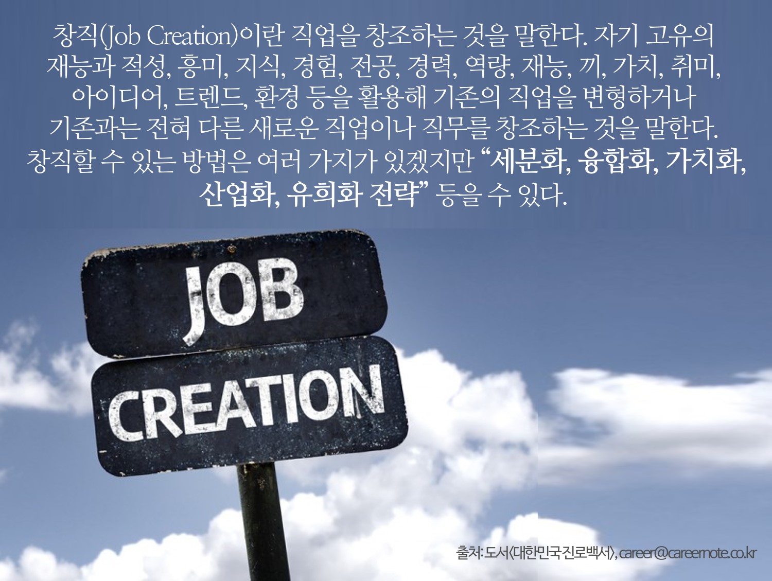 창직(Job Creation)이란 직업을 창조하는 것을 말한다. 자기 고유의 재능과 적성, 흥미, 지식, 경험, 전공, 경력, 역량, 재능, 끼, 가치, 취미, 아이디어, 트렌드, 환경 등을 활용해 기존의 직업을 변형하거나 새로운 직업이나 직무를 창조하는 것을 말한다. 창직할 수 있는 방법은 여러 가지가 있겠지만 크게 세분화, 융합화, 가치화, 산업화, 유희화 전략 등을 들 수 있다. 5가지 방법에 대해 차례대로 알아보자