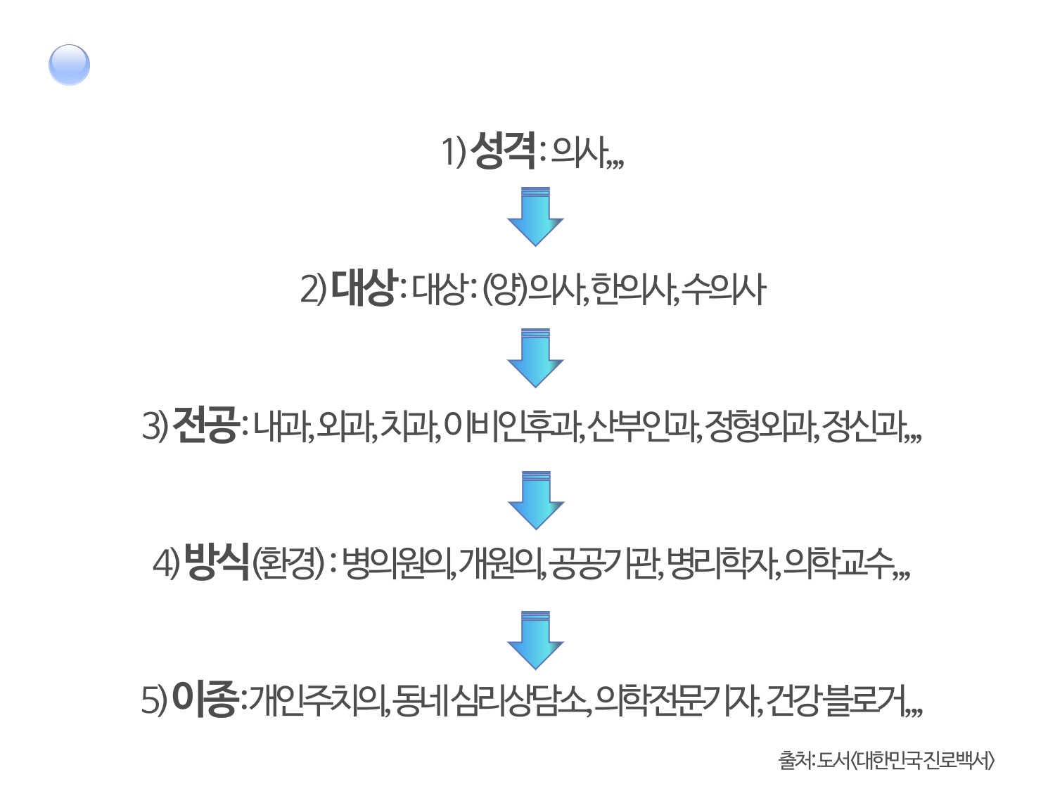 ④ 방식(환경): 병의원의, 개원의, 공공기관, 병리학자, 의학교수…