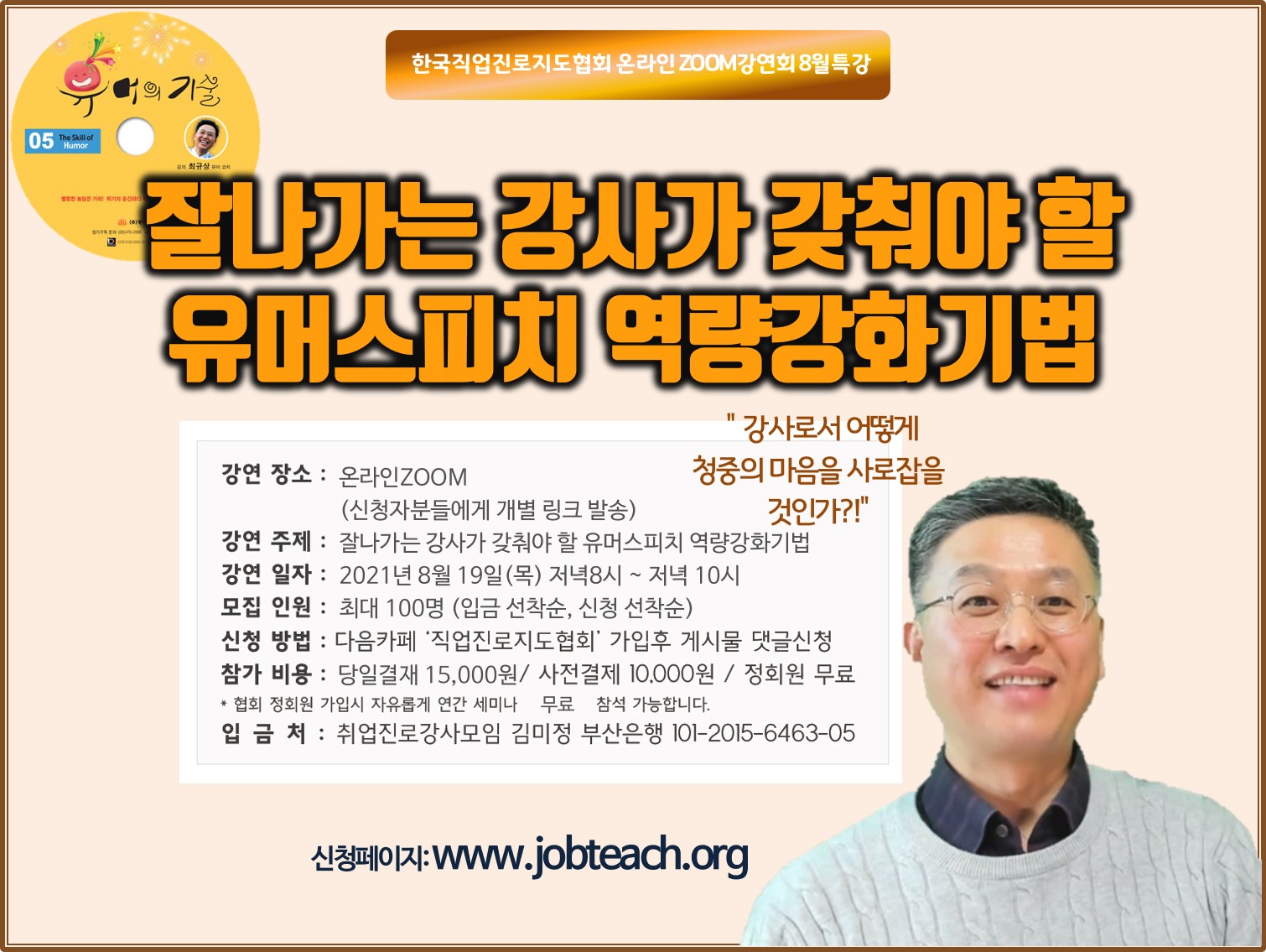 #한국유머전략연구소 #최규상대표 #최규상코치 #유머 #유머스피치 #유머활용 #스팟기법 #유머오프닝 #강의기법 #동기부여 #온라인강의 #특강 #강연 #교육 #직진협 #정기강연회 #온라인강연회 #한국직업진로지도협회 #강사모임 #취업강사 #진로강사 #자기계발강사 #대학교육 #진로교육 #취업교육 #취업진로지도 #취업진로지도전문가 #커리어코치정철상