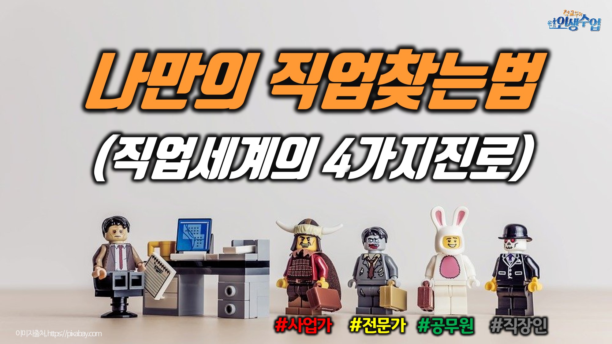 어떻게 사회진출을 준비해 나아가야 할지를 4가지 직업방향과 더불어 직업을 찾을 수 있는 구체적인 방법까지 제시합니다. 어떤 일을 해야 좋을지 갈등하는 분들이라면 좋은 기회 놓치지 말고 끝까지 시청하시길 권합니다.