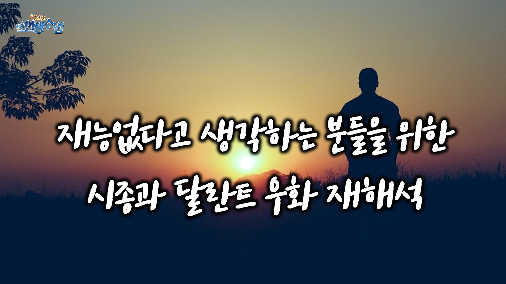 솔직히 처음에는 이 우화의 이야기 그 자체도 황당하다고 생각해서 싫어했는데요. 그렇지만 우화는 조금만 관점을 바꿔서 재해석 하면 보다 큰 의미로 다가오는 경우가 많다는 것도 깨달았답니다. 특히 젊은 날의 저처럼 타고난 재능도 없고, 있더라도 보잘 것 없다고 받아들이는 분들이 계시다면 끝까지 시청하시길 권합니다. 작은 동기부여 느끼실 수 있을 겁니다.