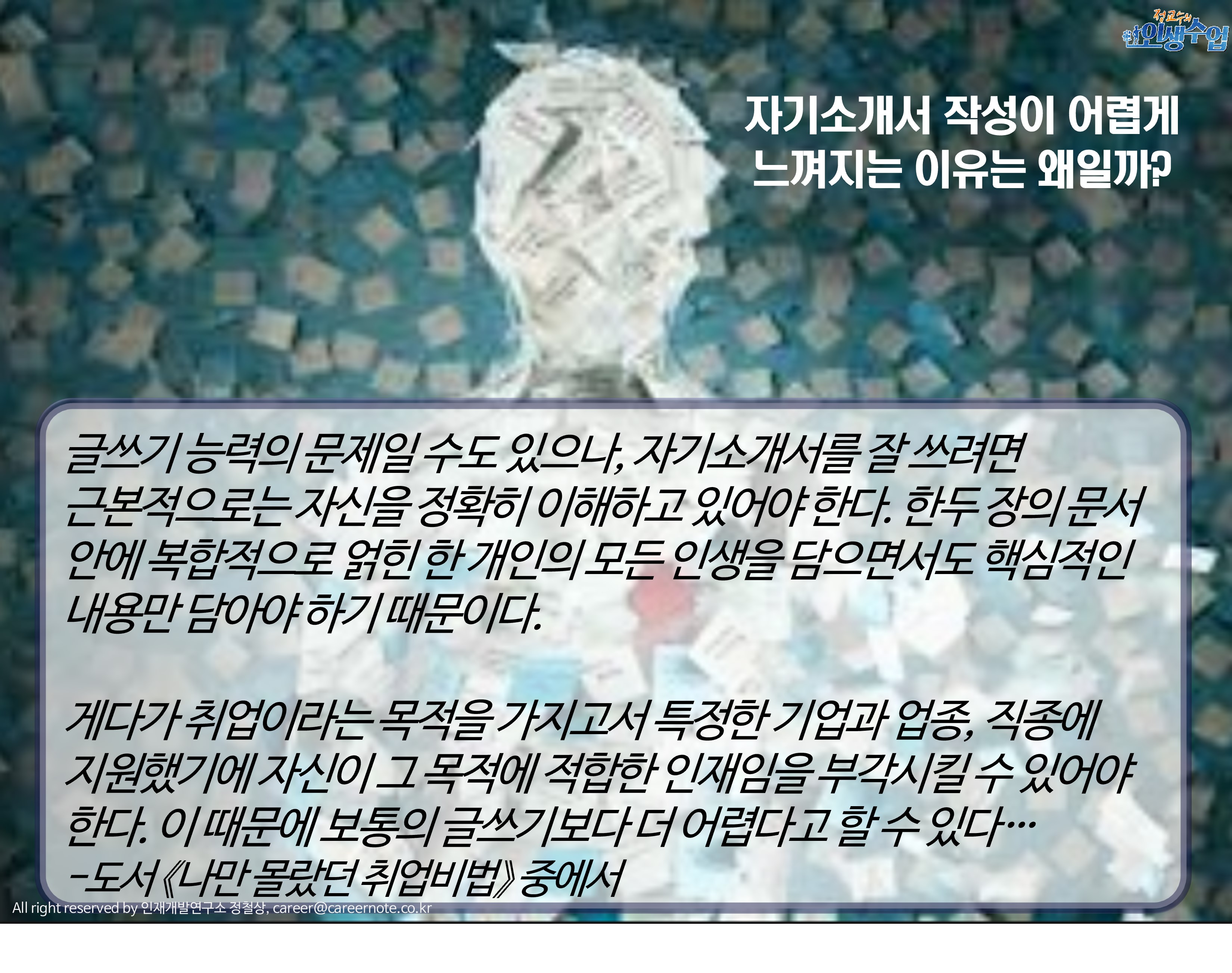 사실 자기소개서를 봐달라는 요청을 거절하고 싶어도 쉽게 하지 못했습니다. 제 업(業)의 특성상 구직자들의 간절한 마음을 누구보다 잘 알기 때문입니다. 저 역시도 능력도 부족하고 불안정한 직장으로 구직자로 일자리를 구해야만 했던 시절이 길었으니까요. 그래서 바쁜 일정 속에서도 시간을 내어 무료로 손봐드렸고, 그렇게 20여년 넘게 지속해 왔습니다.
