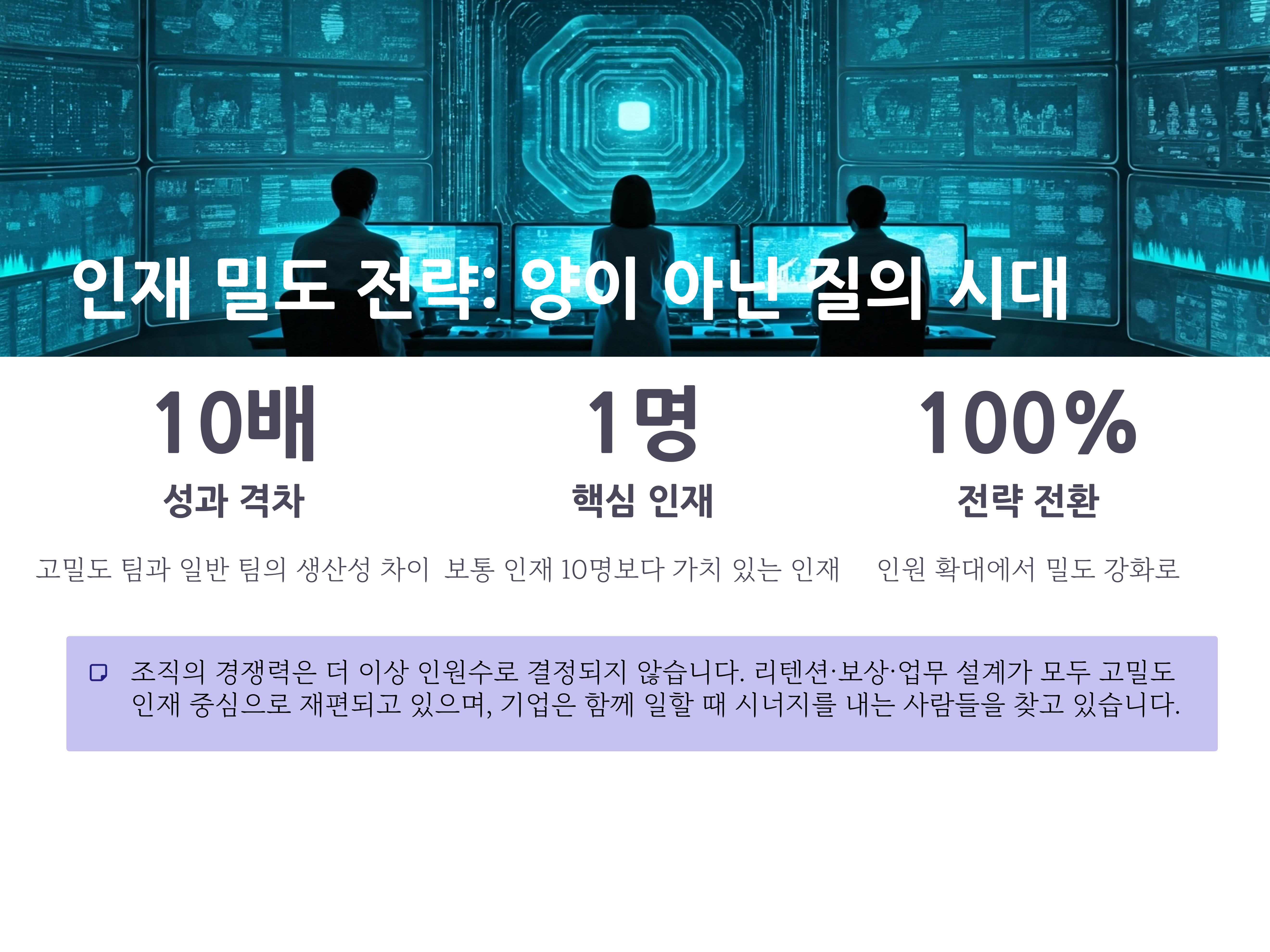 조직은 더 이상 인원을 늘리는 방식으로 경쟁력을 확보하지 않습니다. 이제 중요한 건 양이 아니라 질, 바로 “인재 밀도”입니다. 역량 높은 인재가 모인 팀과 그렇지 않은 팀의 성과 차이가 10배 이상 벌어지는 시대이기 때문입니다.