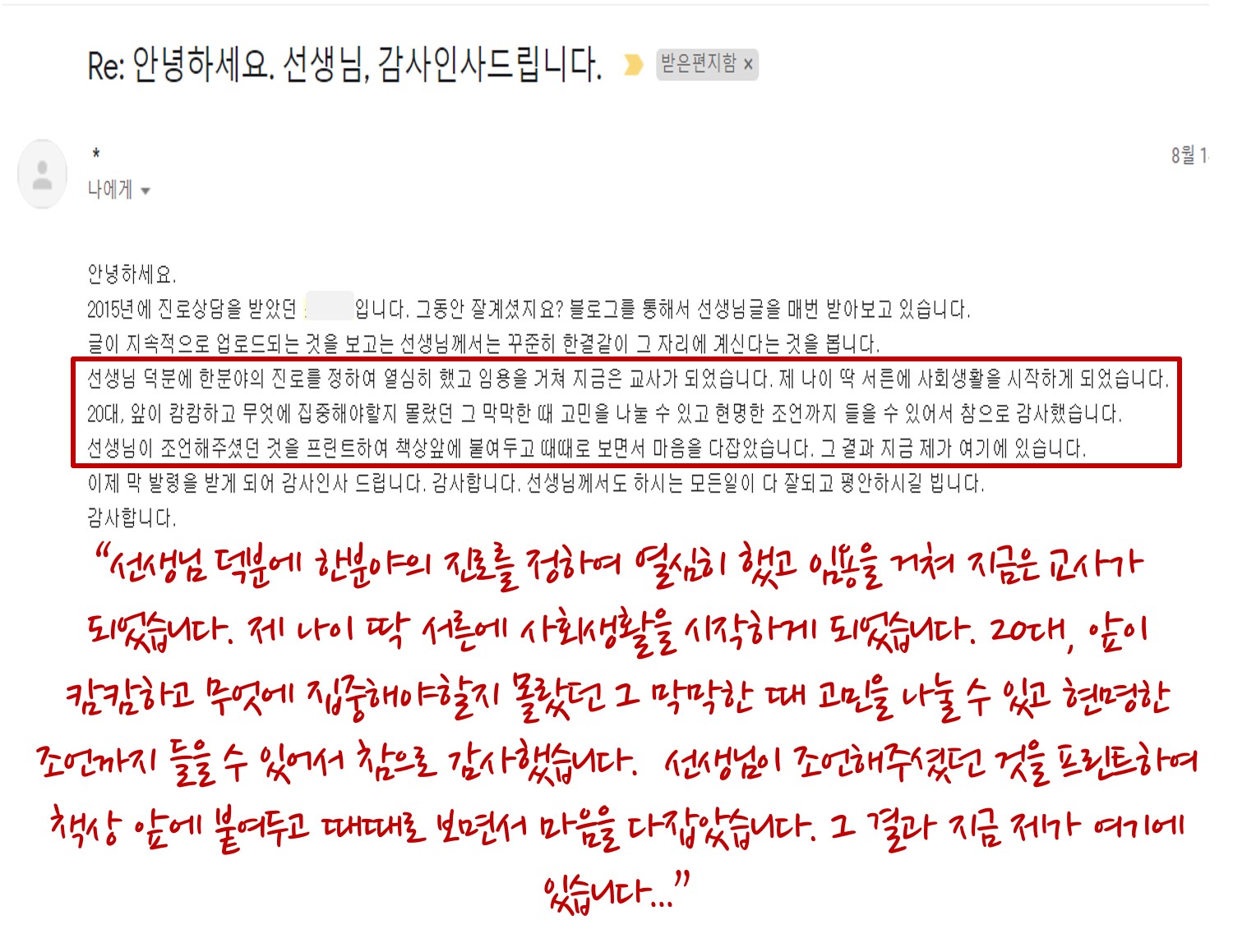 제 메일 박스함에는 여기저기서 고민하는 분들의 상담메일이 늘 답변을 기다리고 있습니다. 나름대로 상담 답변을 충실하게 답변하려고 하고 있습니다. 하지만 시간이 많이 소요됩니다. 빨라도 열흘에서 보름 정도의 시간 걸릴 수도 있습니다. 양해 부탁드립니다.