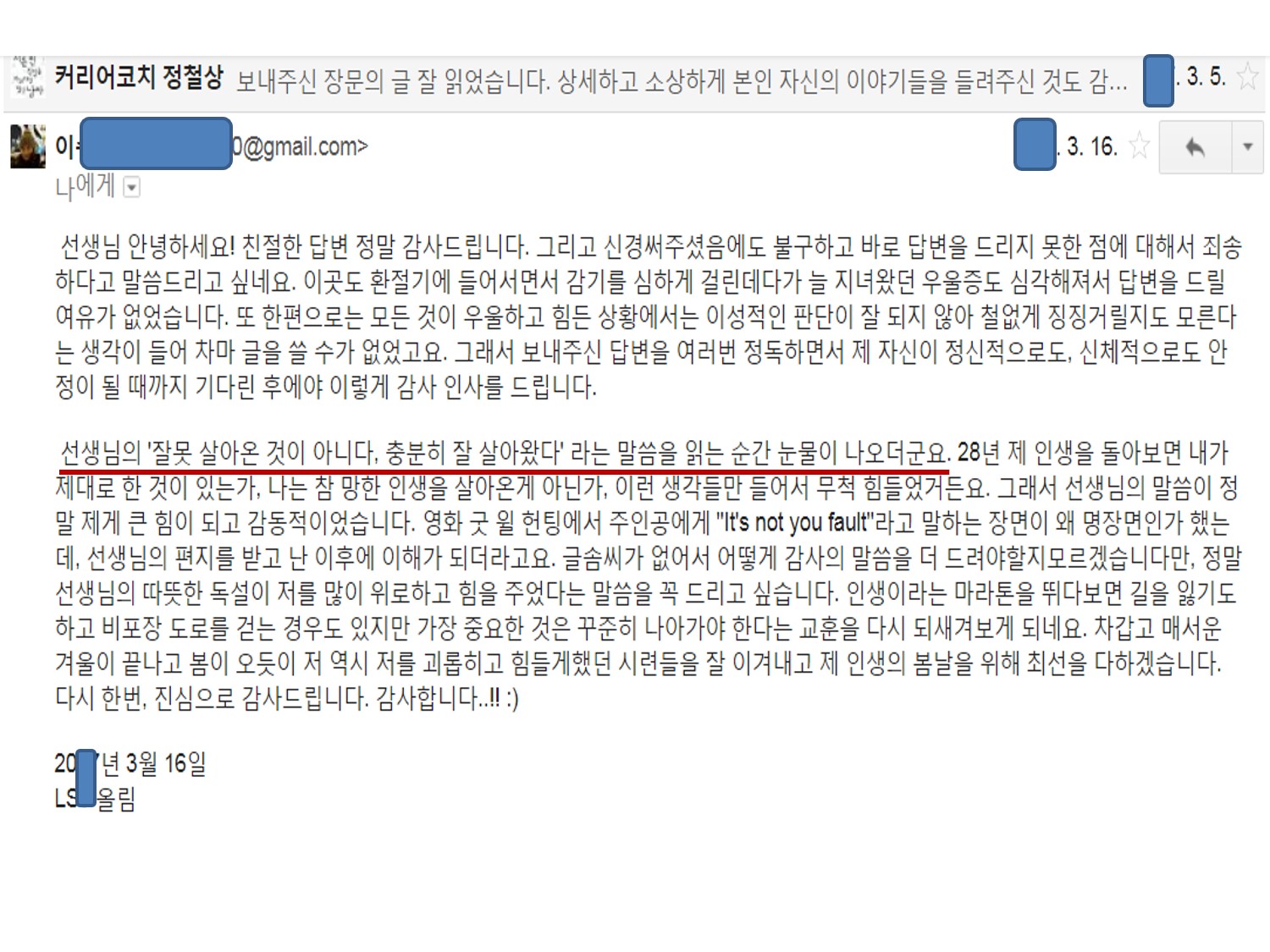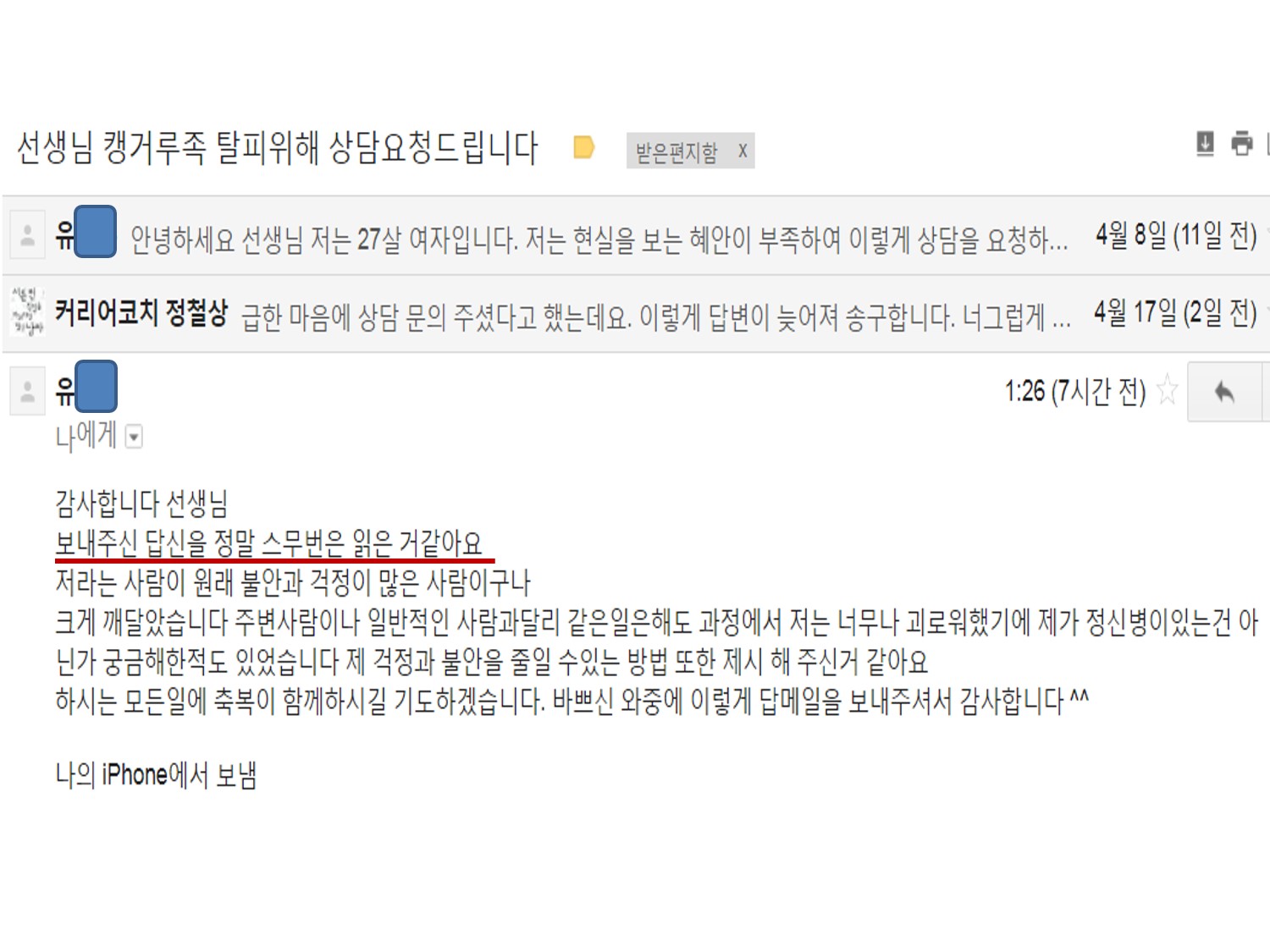 비록 답변이 늦을지라도 주신 상담메일은 지금까지 모두 답변을 드렸습니다. 앞으로도 그러한 초심을 유지하고 싶습니다. 그러니 부디 너그러이 지켜봐주시길 바랍니다. 혹, 한 달이 지나도 못 받아보신 분이 있다면 다시 한 번 확인 요청 메일을 주시길 바랍니다.