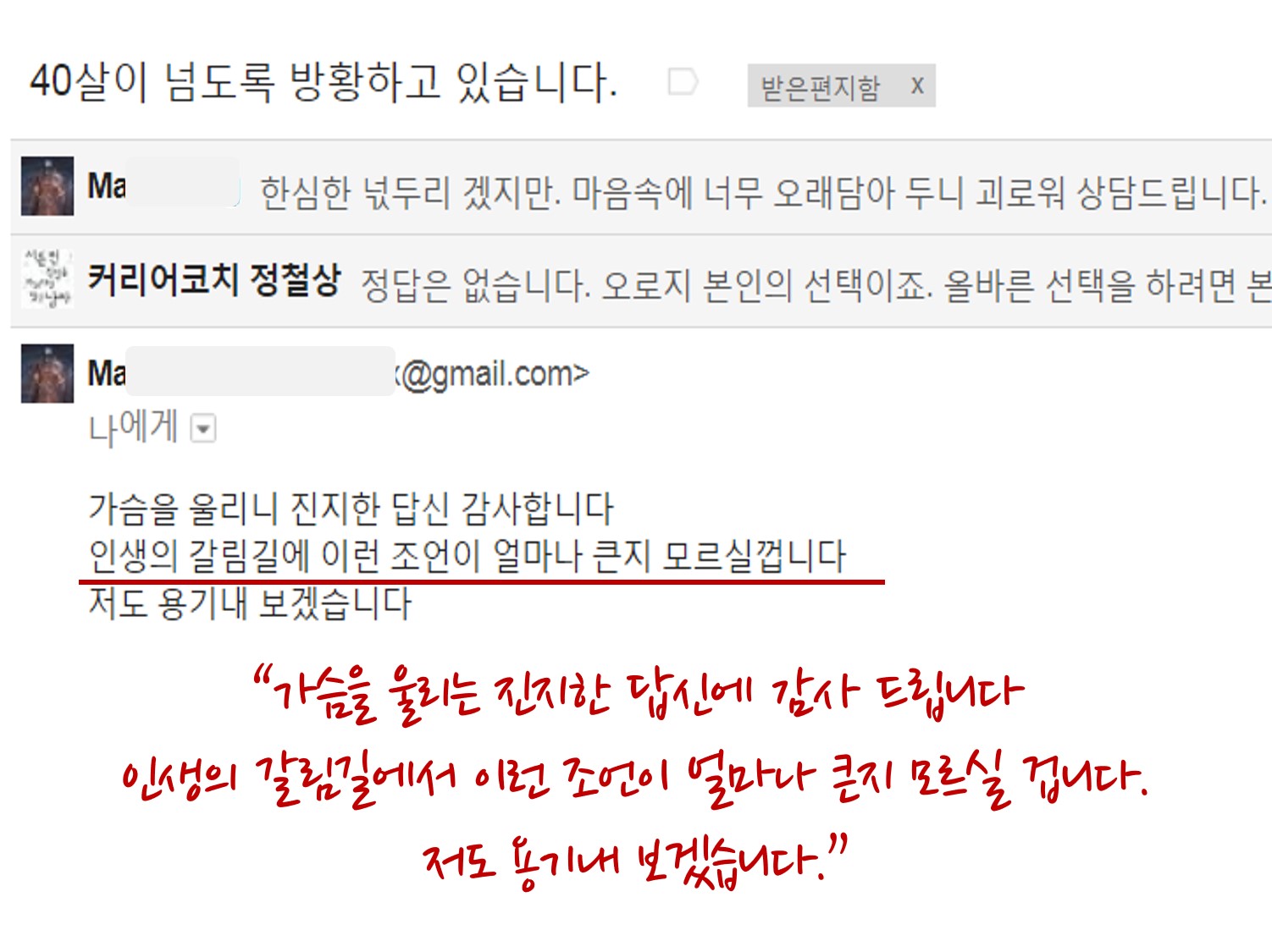이렇게 크게 울림이 있을 거라 기대하진 마시고, 마음 속에 있던 이야기 허심탄회하게 보내주시고 답변 내용에 관계없이 삶의 변화를 이끌어 나가시길 늘 기원합니다.
